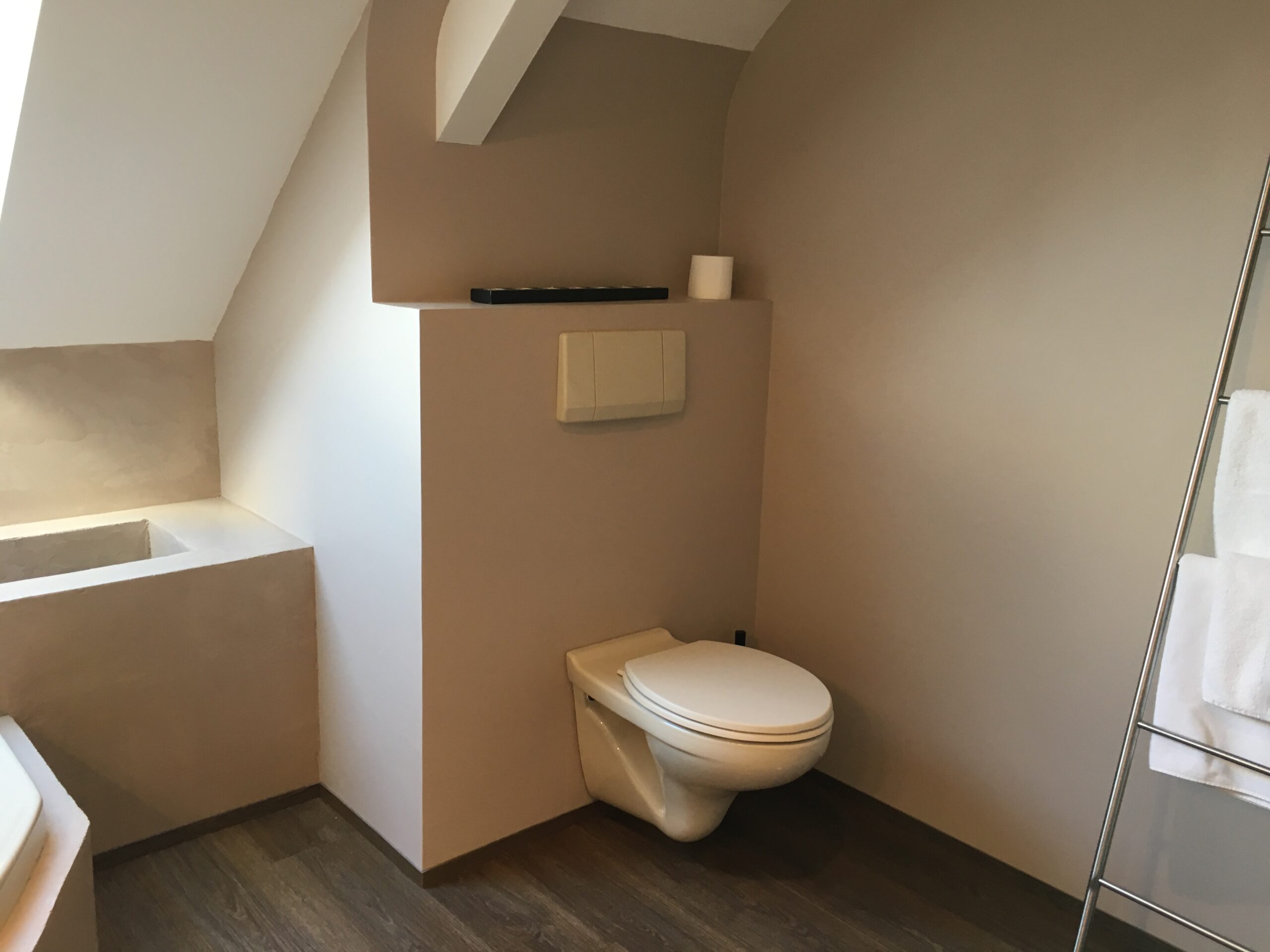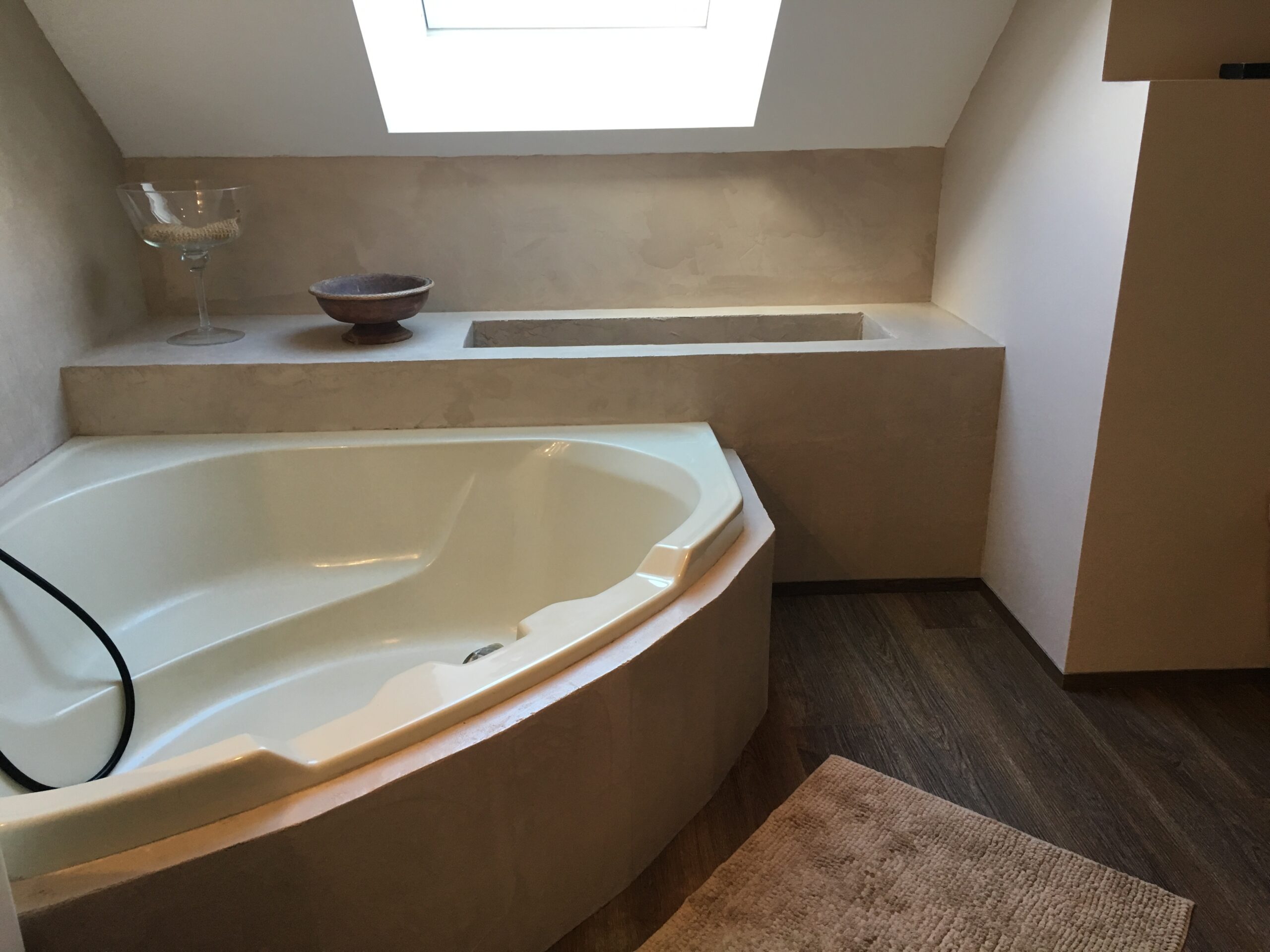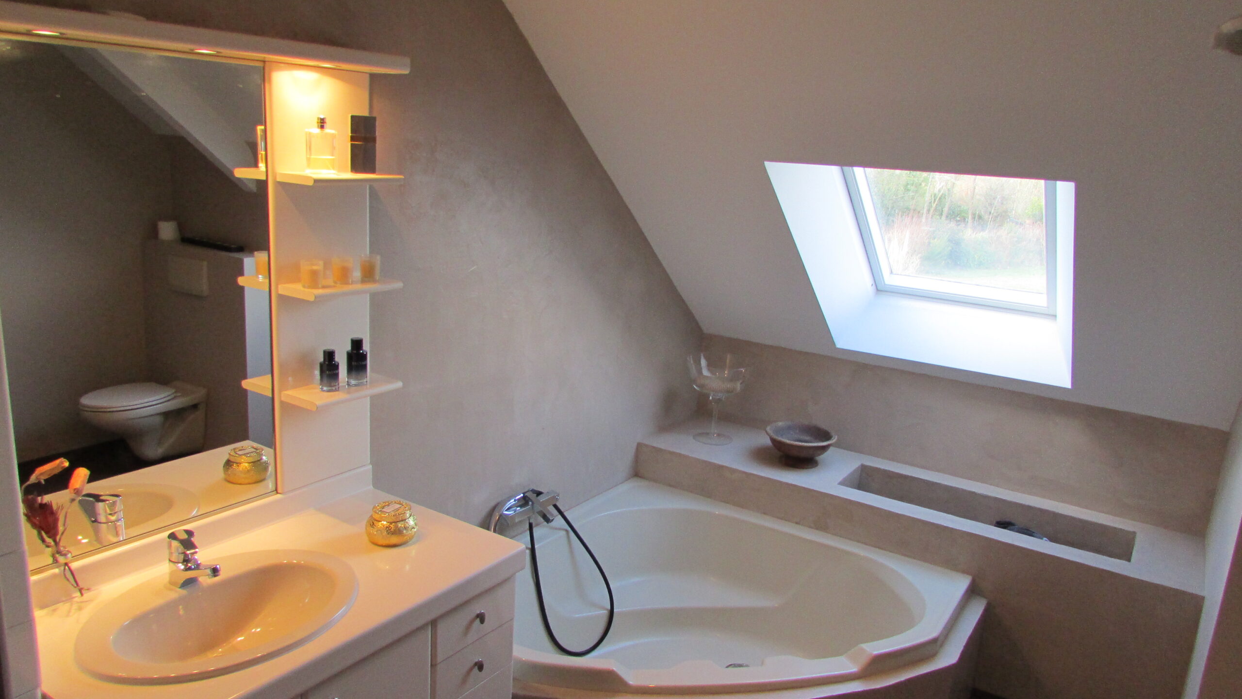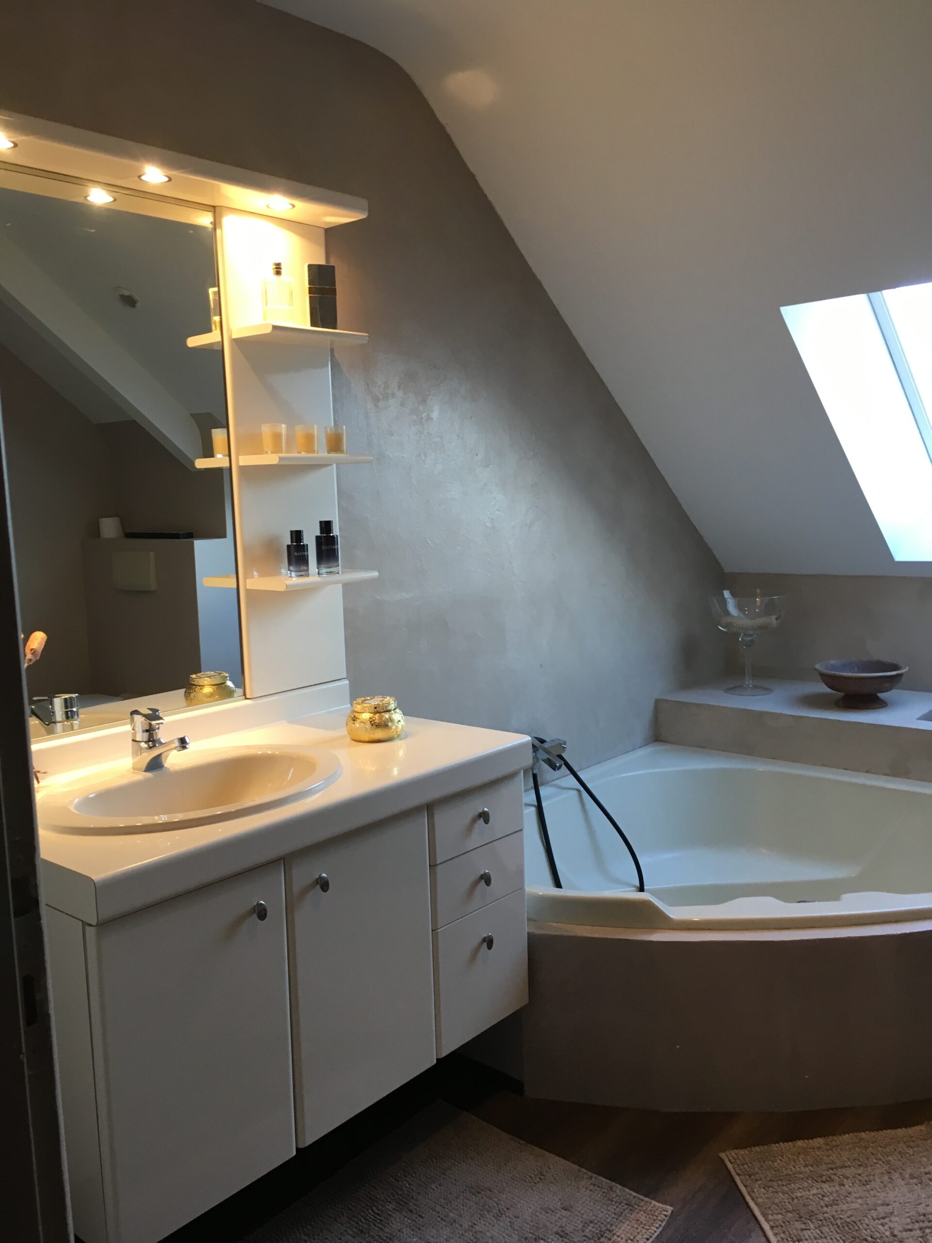 - Pose d’un enduit béton et d’un vernis bicomposant sur les murs de la salle de bain et le tablier de la baignoire