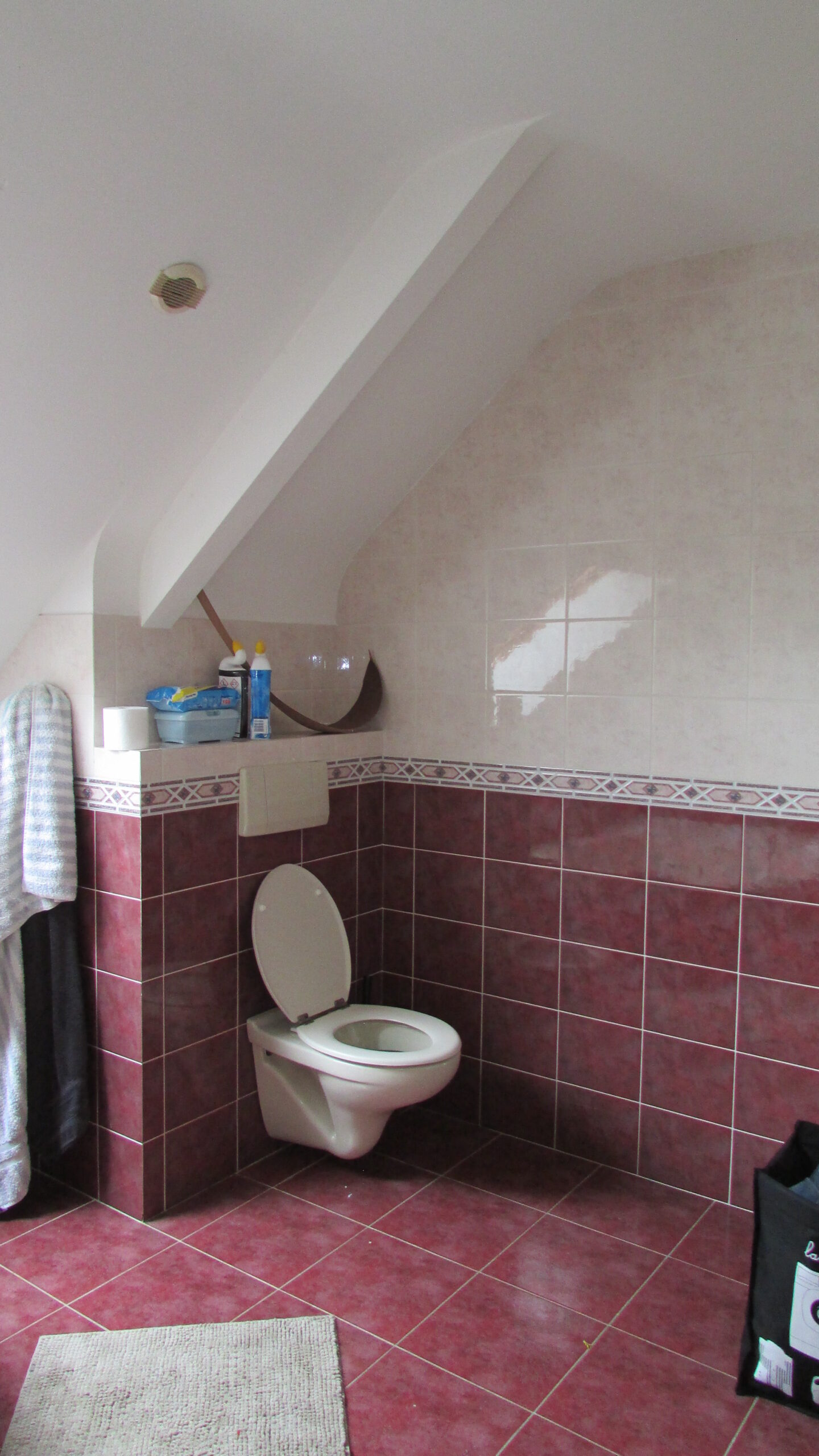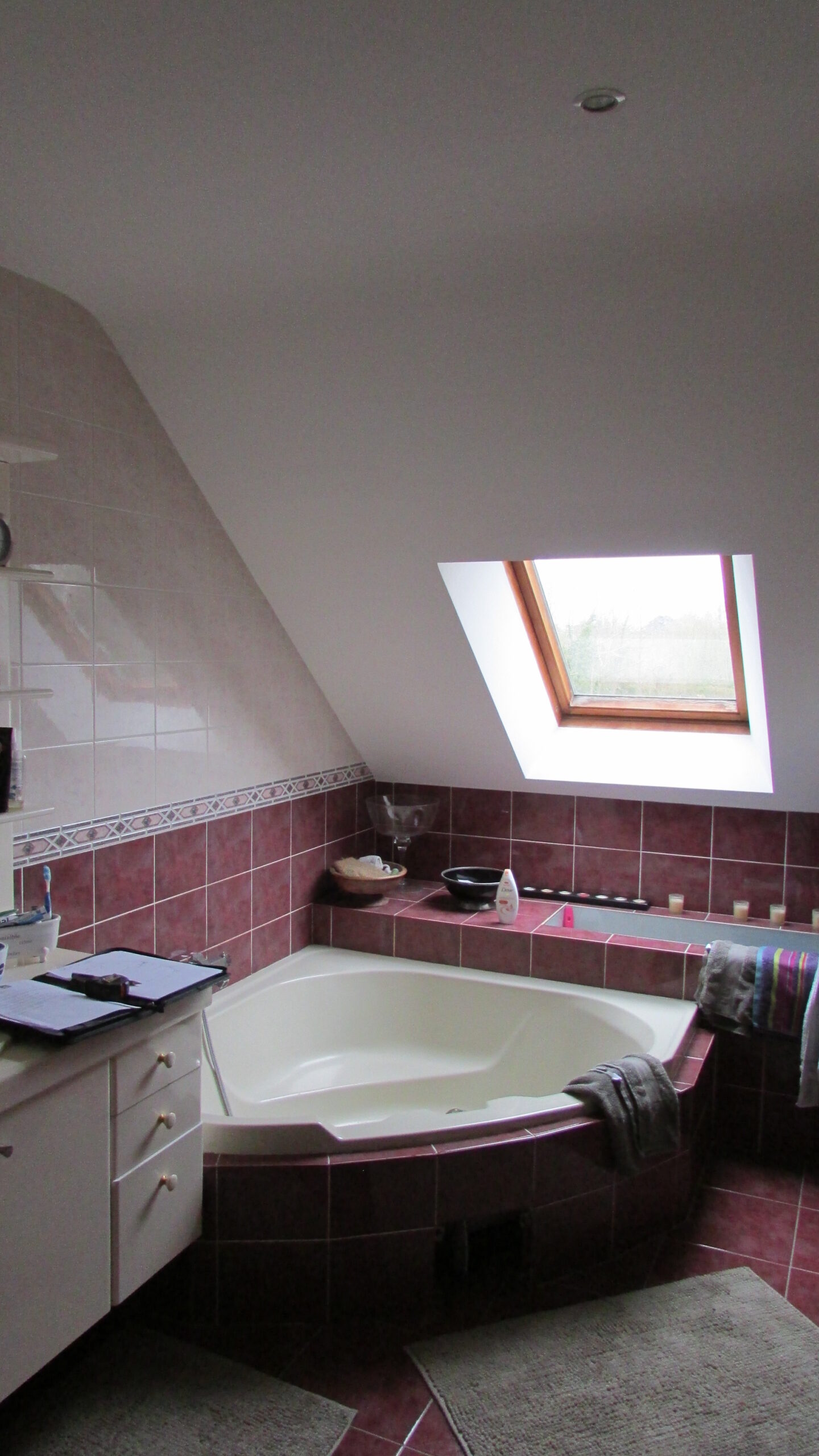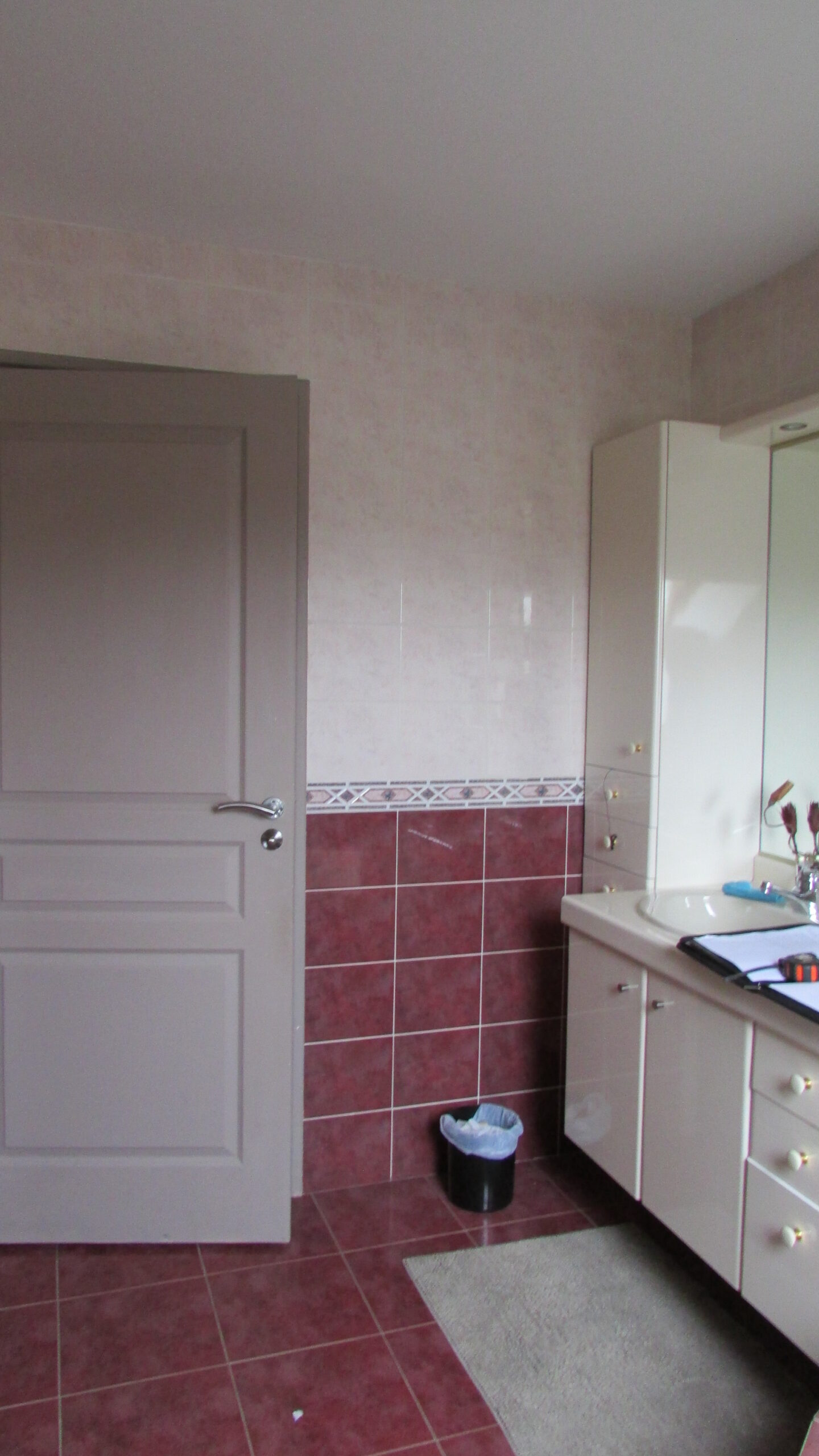Dans une maison habitée, rénovation de la salle de bain de l’étage, en conservant la plomberie (baignoire et toilettes) ainsi que le meuble vasque. L’objectif est de donner un coup de jeune à la salle de bain en refaisant le sol et les murs. Les murs et le plafond de l’entrée de la maison, de la cage d’escalier et du palier de l’étage ont également été rafraichis.